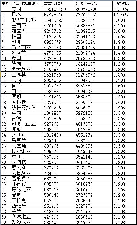出口排名前40位国家和地区名单及重量金额及金额占比