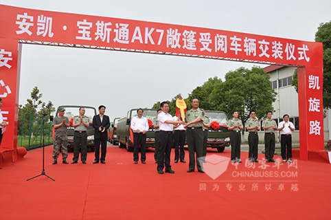 交车仪式上安凯客车领导向军方代表交付新车钥匙